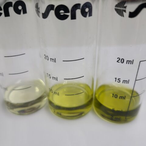 ドイツ発行の説明書内には「赤から茶色をへて緑色へ」と記載がありますが、高濃度(10d°gH値以上)の場合にはハッキリと確認する事が可能です。