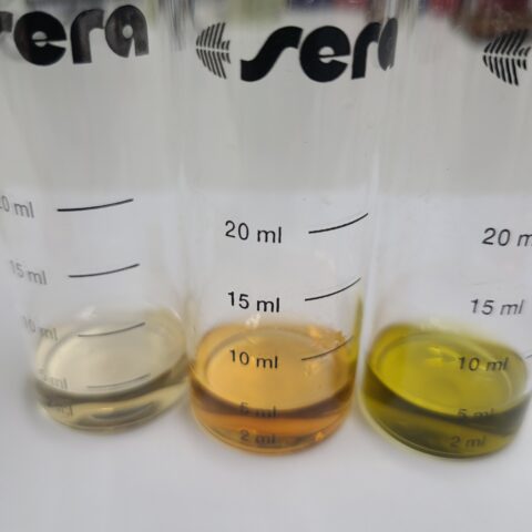 - 黄緑色になるまでに加えた試薬の滴数が、その水の総硬度(単位°dGH)を表します。例:5滴 = 5°dGH